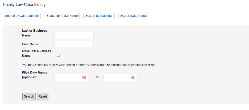 - Click Search by Case Number at the top of the family law search page.