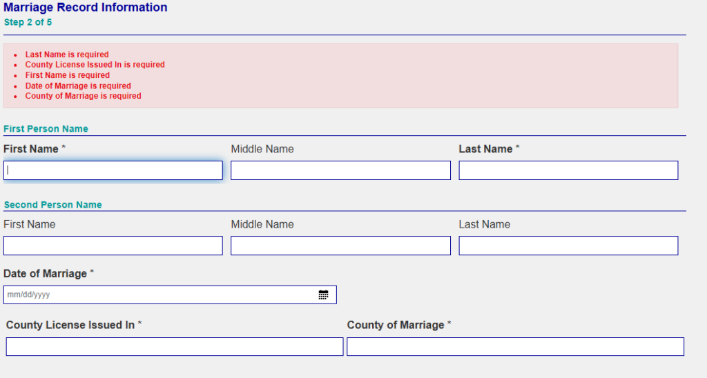 You will now see the Marriage Record Information. Fill in the required fields: